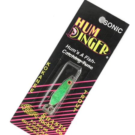 Vihreät kimalteet välkehtivät tämän yksilön nikkeliviimeistelyä vasten ja kiinnittävät välittömästi huomion alkuperäisen läpinäkyvän läpipainopakkauksen läpi. Shasta Tackle Co:n Kalifornian Bella Vistassa valmistama Humdinger on perusvaruste Kokanee-lohen ja taimenen kalastajille. Tämän lusikkauistimen tuotekoodi on 0815, pituus 4 cm (1 1/2") ja paino 3,5 g (1/8 oz). Lusikassa on erottuva kirkkaanvihreä etupuoli, jossa on kontrastivärinen punainen silmäpiste yläosassa, kun taas takapuoli on kirkasta nikkeliä. Se on varustettu yhdellä koukulla, mikä on vakio Kokanee-tekniikoissa. Alkuperäisessä "Sonic"-korttipakkauksessa säilyneen yksilön löytäminen on harvinaista keräilijöille; koska se on käyttämätön ja tehtaan sinetissä, sen kuntoluokitus on 6. Pakkaus korostaa sen erikoissuunnittelua "Hum's A Fish-Catching Tune" -tunnuksella, joka viittaa Shastan Sonic-sarjan brändäykseen. Kortin "Made in USA" -leima vahvistaa sen vintage-alkuperän Bella Vistan tehtaalta.