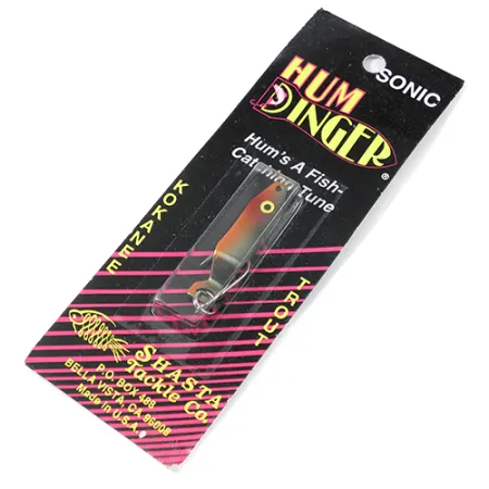 Tämä 3,5 g (1/8 oz) painoinen amerikkalaisvalmisteinen lusikka on erikoistyökalu lohen ja taimenen kalastukseen. Tämän 4 cm (1 1/2") mittaisen mallin viimeistely on Punainen / Ruskea Metalli, jossa on kirkas oranssinpunainen kärki, joka vaihtuu tummempaan, vihreänruskeaan metallisävyyn, vaikka valmistajan etiketissä väri on Silver Green Orange. Tuotekoodilla 2048 tunnistettu viehe on käyttämätön ja alkuperäisessä Shasta Tackle Co. -pakkauksessaan Bella Vistasta, Kaliforniasta. Sen rakenteessa on erityinen rengaskammio, joka on suunniteltu lähettämään jatkuvaa matalataajuista värinää tai hurinaa liikkuessaan vedessä. Monipuoliseen käyttöön suunniteltuna se on tehokas sekä heittokalastuksessa että vetouistelussa, erityisesti 50–120 cm houkutinlevyn perässä vedettynä. 'Sonic'-brändäys ja 'Hum's A Fish-Catching Tune' -slogan korostavat tämän mallin mekaanista painotusta tärppien houkuttelemiseksi.