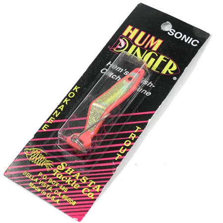 Tässä 14 g (1/2 oz) painoisessa vetolusikassa on erottuva Kultahiekka / Punainen -viimeistely. Siinä on teksturoitu, kimalteleva kultainen etupuoli, jota ympäröi kirkas fluoresoiva punainen reunus. Pituudeltaan 6 cm (2 1/4 tuumaa) oleva Shasta Tackle Co. Humdinger on varustettu erityisellä sonisella rengaskammiolla, joka lähettää jatkuvaa matalataajuista värinää. Tämä 'Sonic'-malli tuottaa lepattavan liikkeen, joka matkii pakenevaa syöttikalaa, tehden siitä erikoistyökalun Kokanee-lohen ja taimenen kalastukseen. Pakkauksen kääntöpuolella on tarkat ohjeet tapsipituuksista: 51 cm – 122 cm vetouistelussa houkutuslevyn (dodger) takana tai 41 cm heittokalastuksessa. Tuotekoodilla 2051 varustettu viehe on käyttämätön alkuperäisessä Bella Vistan, Kalifornian tehtaan pakkauksessa. Värit ovat erittäin näkyvät ja koukut on optimoitu keskinopeaan tai nykivään kelaustapaan.