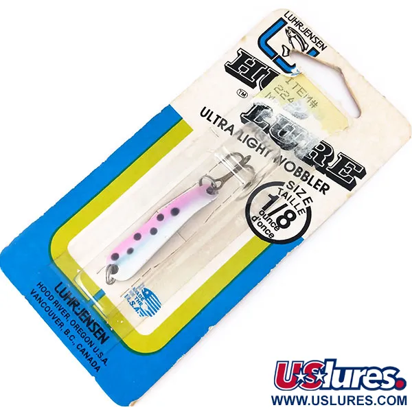 Nikkelipinnoite antaa heijastavan pohjan tälle 4g (1/8oz) metallilusikalle, joka on suunniteltu läpäisemään pintavirtaukset syvemmällä olevien kalojen tavoittamiseksi. Tuotekoodilla 10383 tunnistettava Hus-lure on viimeistelty Kirjolohi-kuviolla, jossa on hienovarainen vaaleanpunaisesta purppuraan taittuva sävy ja selkeät mustat täplät hopeisella rungolla. 4cm (1 1/2") runko on muotoiltu heittokalastukseen, ja sen kapea profiili toimii erinomaisesti niin joissa kuin seisovassa vedessä. Tämä uistin on käyttämätön ja säilynyt alkuperäisessä sini-keltaisessa pahvipakkauksessaan Luhr Jensenin tehtaalta Oregonin Hood Riveristä. Se on varustettu alkuperäisillä tehdasosilla, mukaan lukien pieni uistinrengas ja terävä pronssiviimeistelty kolmihaarakoukku. Jokainen yksityiskohta selkeästä merkinnästä ehjään pakkaukseen heijastaa tämän aikakauden amerikkalaisten kalastusvälineiden laatua.