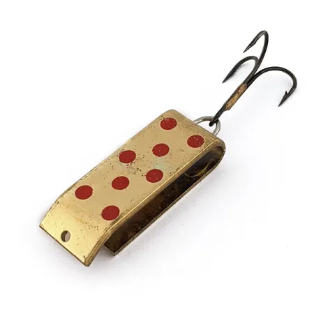 Punaiset pilkut koristavat tämän 3,5 cm (1 1/2") vintage-metalliuistimen klassista kullanväristä viimeistelyä. Tuotekoodilla 18180 tunnistettavassa mallissa on ainutlaatuinen taitettu runkorakenne, joka yhdistää lusikan ja lipan ominaisuudet. Painoltaan 9 g (1/3 oz) Lil Jake on tasapainotettu tarkkoihin heittoihin virtavesissä ja järvillä. Tässä Wyomingissa valmistetussa amerikkalaisessa uistimessa on merkkejä käytöstä, mikä vastaa kuntoluokitusta 4/5. Kultaus on säilyttänyt kirkkaan kiiltonsa suorakaiteen muotoisessa rungossa, joka taipuu jyrkästi siimalenkin kohdalla. Takaosaan on kiinnitetty tukevalla uistinrenkaalla tummunut kolmihaarakoukku, mikä edustaa varhaiselle Jake's Lures -tuotannolle tyypillistä pelkistettyä toimivuutta.