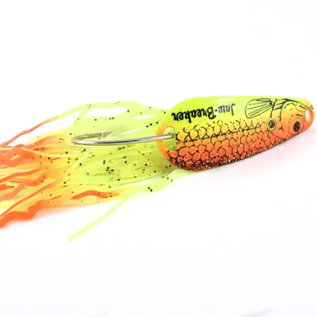 Eloisat fluoresoivat keltaisen ja oranssin sävyt peittävät tämän 15,5 g:n (1/2 oz) metallilusikan, heijastaen Northlandin USA:ssa valmistettujen uistinten rohkeita muotoiluvalintoja. Lusikka on 5,5 cm (2 1/4") pitkä, ja sen kyljessä on selkeä musta "Jaw-Breaker"-leima, joka sijaitsee painetun kalansuomukuvion ja tyylitellyn silmän lähellä. Ruohosuojattu rakenne perustuu vankkaan yksihaarakoukkuun, jota suojaa lankasuojus tiheässä kasvustossa kalastamista varten. Kovaa runkoa täydentää monisäikeinen hapsuhelma yhteensopivissa keltaisen ja oranssin sävyissä, kevyesti mustalla hileellä koristeltuna. Tämä 1094-malli on kuntoluokitukseltaan 4/5; siinä on pieniä pintajälkiä, mutta maalipinta ja hapsujen notkeus ovat säilyneet erinomaisina. Lusikan kapeassa päässä oleva tarkkuusporattu siimalenkki viimeistelee tämän klassisen ruohikkouistimen.