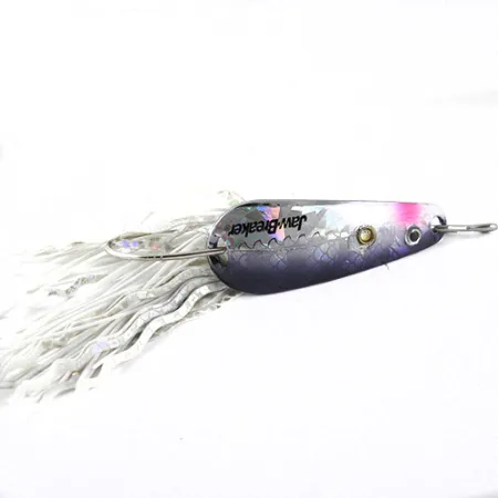 Tämä 1/2 oz (15,5 g) painava Northland-lusikkauistin on suunniteltu kalastukseen paksun kasvillisuuden seassa. Tämän Jaw-Breakerin Nickel / Rainbow -viimeistelyssä on suoraan metalliin syövytetty yksityiskohtainen suomukuvio, joka vaihtuu kiillotetusta hopeasta syvän lila-mustaan vatsaan, jossa on kirkkaan vaaleanpunainen korostus pään lähellä. Pituudeltaan 2 1/4" (5,5 cm) oleva yksilö (tuotekoodi 1112) edustaa klassista amerikkalaista ruohosuojattua rakennetta, jossa tukeva lankasuoja suojaa yksittäiskoukkua. Kerroksittainen valko-hopeinen silikonihame tuo pyrstöön visuaalista kokoa. Lusikan kuperaan puoleen on leimattu selkeä "Jaw-Breaker"-tuotemerkki upotetun kultaisen silmän viereen. Viehe on uudenveroisessa kunnossa (arvosana 5/5). Nokan kestävä uistinrengas kertoo sen käyttötarkoituksesta: kalojen kiskomisesta lumpeikkojen ja tiheän kasvuston keskeltä.