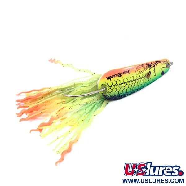 Elinvoimainen Fire Tiger -kuviointi siirtyy kirkkaan oranssista kärjestä keltaisen kautta syvän vihreään takaosaan tässä Northlandin vintage-löydössä. Tuotekoodilla 1970 varustettu Jaw-Breaker Weedless Spoon on pituudeltaan tasan 5,5 cm (2 1/4") ja painoltaan 15,5 g (1/2 oz). Lusikan rungossa on selkeä suomukuviointi ja tunnusomainen "Jaw-Breaker"-brändäys keskellä. Raskaaseen kasvillisuuteen suunniteltu rakenne sisältää vankan yksittäiskoukun, jota suojaa lankainen ruohosuoja, sekä monivärisen silikonihapsun limenvihreän ja oranssin sävyissä. Kääntöpuolella on tasainen chartreuse-viimeistely, joka on tarkoitettu hyvään näkyvyyteen tiheässä kaislikossa kalastettaessa. Tämä yksilö on huippukunnossa (5/5), ja kaikki osat sekä hapsun materiaali ovat joustavia ja ehjiä.