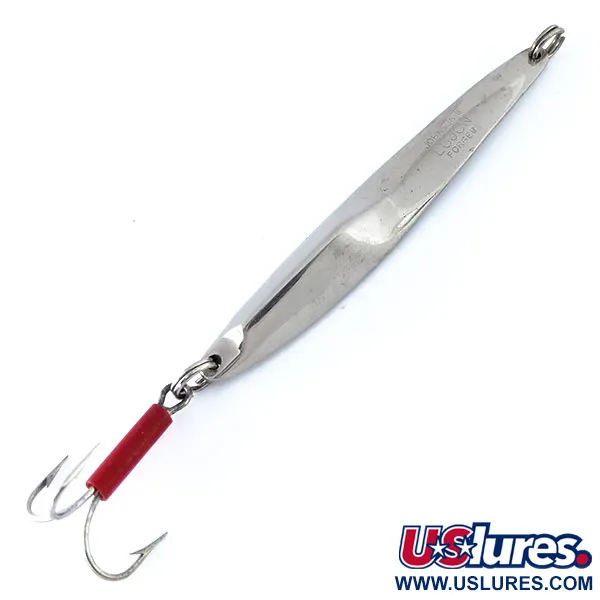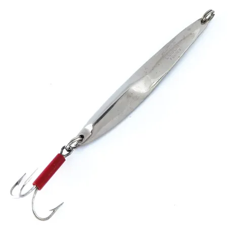 Nikkelöityyn metalliin on selkeästi leimattu tunnus ”JOHNSON LUJON 1”, mikä osoittaa tämän vieheen olevan aito palanen amerikkalaista kalastushistoriaa. Tämän 31 g (1 oz) painoisen vieheen raskas ja solakka runko on suunniteltu erityisesti syvän veden pystyjigaukseen tai pitkän matkan heittoihin vastatuuleen. 9 cm (3 1/2") profiilissa on ainutlaatuinen, epäsymmetrinen kierre metallissa, mikä on suunnittelun tunnusmerkki valon heijastamiseksi useista eri kulmista. Tämä yksilö on siistissä 4/5-kunnossa, ja siinä on korkealaatuinen nikkeliviimeistely, josta Johnson tunnettiin USA:n tuotantovuosinaan. Huomionarvoinen yksityiskohta on kolmihaarakoukun varressa oleva kirkkaanpunainen putki, joka toimii perinteisenä iskupisteenä petokaloille. Sekä päässä että pyrstössä on raskaaseen käyttöön tarkoitetut uistinrenkaat, ja tämä viehe, tuotekoodi 11094, heijastaa vuosisadan puolivälin jigikalastustarvikkeiden vankkaa rakennetta.