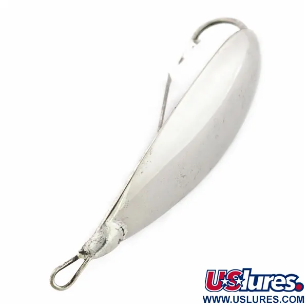 Kupari-sinkkiseoksesta meistetty lusikka on keskeltä selvästi paksumpi, mikä auttaa sitä pysymään pystyasennossa kelauksen aikana. Tämän Johnson Silver Minnow Weedless -uistimen kirkas nikkelipinnoite on kuntoarviolla 5/5, mikä tarkoittaa sen olevan poikkeuksellisen hienossa kunnossa. Viehe painaa 2/5 oz (12 g) ja on pituudeltaan 2 1/4" (6 cm). Siinä on tunnusomainen ruohosuojalanka, joka on suunniteltu uimaan tiheän kasvuston läpi tarttumatta kiinni. Toisin kuin nykyaikaiset mallit, tämä yksilö #24548 on peräisin klassiselta USA:n valmistusaikakaudelta. Lusikan leveä runko on suunniteltu tuottamaan 270 asteen vaappuva liike, joka heijastaa välkkeitä alas ja sivuille, joista petokalat yleensä iskevät. Rakenne minimoi siiman kiertymisen ylläpitämällä vakaan ja rytmisen liikkeen vedessä. Usein yhdistettynä pork rind -lisäkkeeseen näkyvyyden parantamiseksi, lusikan uinti säilyy vakaana jopa lisäpainon tai -massan kanssa. Koukku on integroitu suoraan runkoon, jotta kärki pysyy ylöspäin, matkien tehokkaasti pikkukalaa, joka puikkelehtii lumpeiden tai kaislikon seassa.