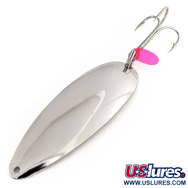 Klassinen 1/2 unssin (14 g) paino tekee tästä yksilöstä monipuolisen valinnan heittokalastukseen tai kevyeen vetouisteluun eri vesisyvyyksillä. Kiillotettu nikkelipinta antaa voimakkaan välkkeen, mikä on tyypillinen piirre vanhemmille Yhdysvalloissa valmistetuille Johnson Sprite -uistimille ennen tuotannon siirtymistä ulkomaille. Tuotekoodilla 11256 tunnistettu uistin edustaa kotimaisen käsityön aikakautta, jota keräilijät arvostavat materiaalin laadun vuoksi. Metallin kääntöpuolelle on stanssattu selkeästi 'Johnson Sprite' -nimi, mikä takaa aidon brändäyksen mihin tahansa vintage-viehekokoelmaan. Pieni, kirkkaanpunainen muovinen iskupiste on kiinnitetty uistinrenkaaseen kolmihaarakoukun viereen, luoden selkeän visuaalisen keskipisteen hopeista runkoa vasten. Pituudeltaan 2 3/4 tuumaa (7 cm), lusikan pisaranmuotoinen profiili on suunniteltu vakaaseen uintiin. Tuote on erinomaisessa kunnossa ja saa arvosanan 5/5 kirkkaan, peilimäisen pintansa ja hyvin säilyneiden alkuperäisten osiensa ansiosta.