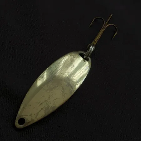 Kultapinnoite peittää tämän vintage-lusikkauistimen 5 cm:n (2 tuuman) pisaranmuotoisen rungon. Yhdysvalloissa valmistettu Johnson Sprite painaa monikäyttöiset 7 g (1/4 oz), mikä tekee siitä luotettavan valinnan petokalojen kalastukseen eri vesisyvyyksistä. Koverassa sisäpinnassa on selkeä ”JOHNSON’S SPRITE” -leima, joka on merkki brändin vuosisadan puolivälin tuotannosta. Sen rakenteeseen kuuluu kestävä kolmihaarakoukku, joka on kiinnitetty perään tukevalla uistinrenkaalla, ja kärjessä on valmis kiinnityslenkki siiman tai viehelukon kiinnittämistä varten. Tuotekoodilla 22722 varustetun uistimen kuntoluokitus on 4/5, mikä tarkoittaa hienoisia käytön jälkiä, jotka tuovat luonnetta vahingoittamatta metallipinnan eheyttä. Kiillotettu ulkopinta takaa voimakkaan välkkeen, joka soveltuu erinomaisesti sekä heitto- että vetouisteluun.