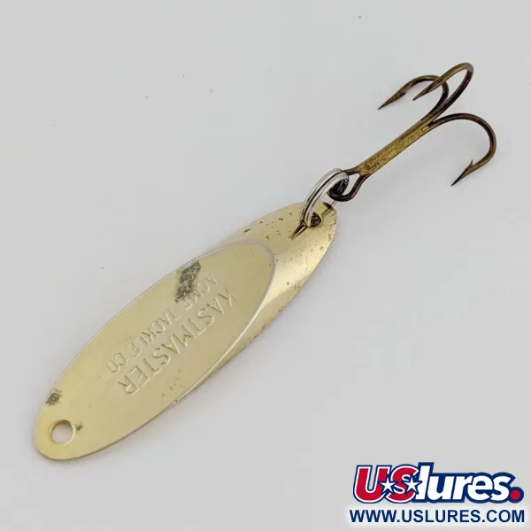 Kultainen viimeistely antaa tälle viistoon leikatulle lusikkauistimelle heijastavan välkkeen, joka näkyy jopa sameassa vedessä. Acmen tässä 1/4 oz (7 g) uistimessa käyttämä erikoismetalliseos tarjoaa tarkan tiheyden, jota tarvitaan tasapainoiseen uppoamisnopeuteen. Kooltaan 1 3/4" (4,5 cm) oleva kapeneva profiili auttaa pitkän matkan heittotarkkuudessa. Tämä yksilö on 4/5-kunnossa; pinnoitteessa on hieman hapettumajälkiä, mutta alkuperäinen muoto on tallella. Tuotekoodin 24505 tunnistetiedot sisältävät selkeästi stanssatun tuotemerkin ja valmistajan etupuolella. Lusikka toimii luotettavasti joko raskaana pilkkinä syvässä vedessä tai virrassa kelattuna.