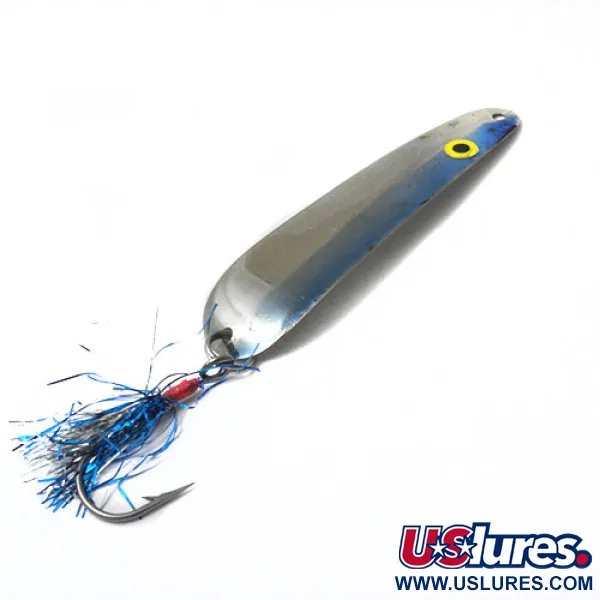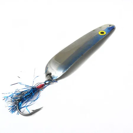 Nikkeli- ja sininen viimeistely määrittelevät tämän Yhdysvalloissa valmistetun, 1/8oz (3,7g) painoisen uistelu-lusikan virtaviivaisen profiilin. Kausch 14 on 3 1/4" (8cm) pitkä ja se on rakennettu hoikkaan metallirunkoon, joka on suunniteltu syvän veden uisteluun. Yläpinnalla on kirkas sininen raita heijastavan nikkelin rinnalla, ja kiinnityspisteen lähellä on selkeä kelta-musta maalattu silmä. Visuaalisen houkuttelevuuden lisäämiseksi yksihaarainen koukku on sidottu sinisillä ja hopeisilla tinsel-kuiduilla, jotka on kiinnitetty pienellä punaisella sidoksella. Vieheen puhtaalta, maalaamattomalta alapuolelta löytyy tuotekoodi 0441. Kunnoltaan 4/5 oleva metallipinta on säilyttänyt alkuperäisen kiiltonsa ja siinä on vain vähäisiä käytön jälkiä. Molemmissa päissä on käytetty kestäviä uistinrenkaita varmistamaan koukun ja siiman pysyvyys koko päivän ajan.