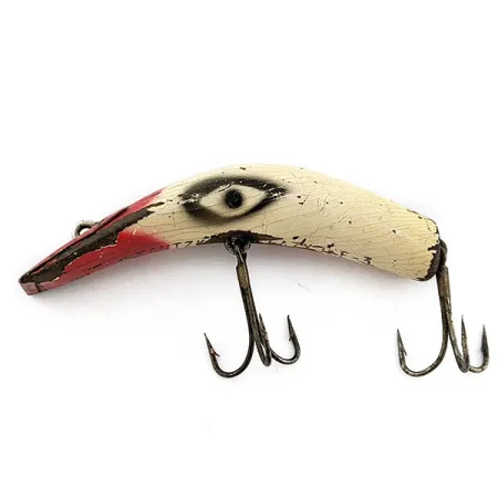 Tunnistettava kaareva runko määrittelee tämän 7 cm (2 3/4") pituisen puu-uistimen siluetin, mikä on tyypillistä vuosisadan puolivälin amerikkalaiselle käsityötaidolle. 9 g (1/3 oz) painava Kautzky Lazy Ike 3 kantaa tuotekoodia 20123, ja siinä on kermanvärinen runko, jota korostavat kirkkaanpunainen etuosa sekä suuret, maalatut bullseye-silmät. Pinnassa näkyy luonnetta antava hienonhienojen halkeamien verkosto ja merkittävää maalin kulumista käytöstä johtuen, mikä vastaa kuntoluokitusta 3/5. Kyljen keskelle sijoitettu alkuperäinen tehdaspainatus osoittaa sen alkuperän ja mallinumeron selvästi. Kaksi vatsapuolelle kiinnitettyä kolmihaarakoukkua ovat voimakkaasti hapettuneet ja ikääntyneet, mikä kertoo tämän Iowassa valmistetun uistimen pitkästä historiasta.