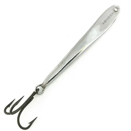 Nikkelipinnoite antaa tälle solakalle 40g (1 1/3 oz) jigille kirkkaan, heijastavan pinnan, joka kimaltaa vedessä tehokkaasti. Runkoon on selkeästi meistetty "KENDEN"-nimi, joka on osoitus amerikkalaisesta käsityöstä sen alkuperämaasta USA:sta. Pituudeltaan 9,5 cm (3 3/4") oleva malli, tuotekoodiltaan 6848, on varustettu ohuella ja aerodynaamisella profiililla, joka on suunniteltu painumaan syvyyksiin nopeasti. Varustukseen kuuluu tummapintainen kolmihaarakoukku, joka on kiinnitetty tukevalla uistinrenkaalla, ja siiman kiinnityspisteenä toimii selkeä reikä suippenevassa päässä. Kiillotettu pinta on erinomaisessa kunnossa (arvosana 5/5), säilyttäen nikkelipinnoitteen alkuperäisen hohdon. Paino ja virtaviivainen muoto tekevät tästä täsmäaseen vertikaalijigaukseen tai pitkän matkan heittoihin kovassa virrassa.