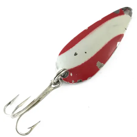 Tämän 1 3/4" (4,5 cm) pituisen vintage-lusikkauistimen pisaranmuotoisessa rungossa on klassinen punavalkoinen diagonaaliraitakuvio. Heijastavaan nikkelöityyn kääntöpuoleen on meistetty Keystone-nimi, mikä kertoo sen alkuperästä ja perinnöstä Yhdysvalloissa. Painoltaan 3/16 unssia (5,5 g) oleva uistin on varustettu alkuperäisillä osillaan, mukaan lukien hopeanvärinen uistinrengas ja kestävä kolmihaarakoukku. Maalattu pinta on saanut luonnetta käytössä, ja reunoilla on hieman maalin lohkeilua, mikä antaa uistimelle kuntoluokituksen 4/5. Tuotekoodilla 6245 tunnistettu lusikka hyödyntää maalatun yläpuolen ja kiillotetun metallisen alapuolen välistä kontrastia maksimoidakseen välkkeen tasaisen kelauksen aikana.