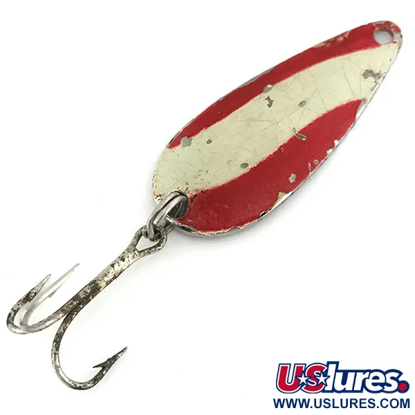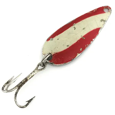 Punaiset ja valkoiset vinoraidat määrittelevät tämän Keystone-lusikan pinnan, mikä on tunnusomaista 1900-luvun puolivälin yhdysvaltalaiselle uistinsuunnittelulle. Painoltaan 3/16oz (5,5 g) painava metallirunko on 1 3/4" (4,5 cm) pitkä ja siinä on perinteinen pisaramuoto, joka on tarkoitettu heittokalastukseen. Tämä yksilö, tuotekoodiltaan 6934, on kuntoluokitukseltaan 3/5; maalattu pinta osoittaa ikään liittyvää kulumista ja pieniä lohkeamia, jotka korostavat sen historiaa vesillä. Kääntöpuoli on nikkelipinnoitettu, ja sen sävy on pehmentynyt vuosien saatossa. Pyrstöön on kiinnitetty tukevan uistinrenkaan avulla yksi kolmihaarakoukku, kun taas päässä on selkeä silmukka peruketta tai pikalukkoa varten. Vaikka valmistaja on tuntematon, rakenne heijastaa perinteisille amerikkalaisille kalastusvälineille tyypillistä suoraviivaista ja kestävää laatua.