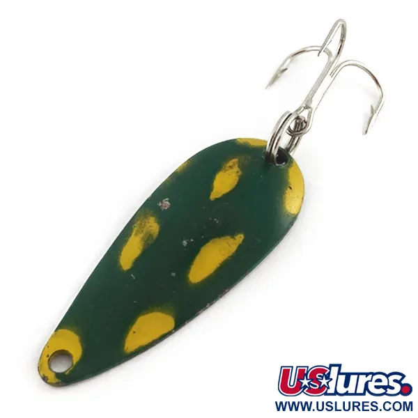 Vihreä-keltainen sammakkokuviointi korostaa tämän 5 gramman (3/16 oz) Keystone-lusikan muotoa. Yhdysvalloista peräisin olevan uistimen pituus on 4,5 cm (1 3/4") ja se löytyy tuotekoodilla 23494. Maalipinnassa on nähtävissä iän tuomaa rehellistä kulumaa, ja tämä hyvin pidetty yksilö on kuntoluokitukseltaan 4/5. Siinä on tukeva uistinrengas ja kirkas kolmihaarakoukku peräpäässä, kun taas etupää on viimeistelty yksinkertaisella pyöreällä siimalenkillä.
