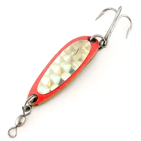 Tämä 9 gramman painoinen Luhr Jensen Krocodile on suunniteltu tilanteisiin, joissa heittopituus ja syvyyden saavuttaminen ovat etusijalla. Punaista / Messinkistä runkoa korostaa prismamainen helmiäis-suomupinta, joka välähtää houkuttelevasti vedessä. Yksi sen teknisistä huippuominaisuuksista on fluoresoiva maali; UV-valossa punainen reuna hehkuu voimakkaasti, mikä tekee siitä erinomaisen valinnan lohen kalastukseen syvissä tai värjäytyneissä vesissä. Pituudeltaan 4 cm lusikan paksu metallirunko ja kapea profiili ovat Krocodile-muotoilun tunnusmerkkejä, jotka maksimoivat heittoetäisyyden laitureilta tai veneistä. Tämä yksilö, tuotekoodiltaan 12316, on 5/5-kunnossa ja erittäin siisti alkuperäisillä osilla ja viimeistelyllä. Se on varustettu laadukkaalla leikarilla ja tukevalla kolmihaarakoukulla.