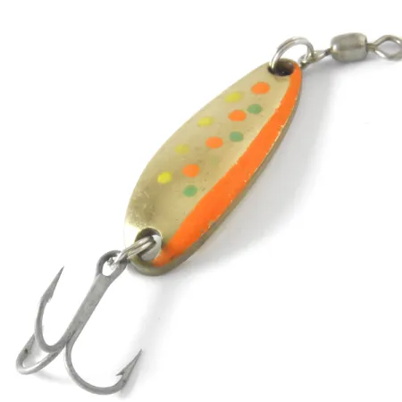 Kääntöpuolen messinsävyisessä metallissa on syvä Luhr Jensen -leimaus, joka kertoo tämän yksilön alkuperästä. Tukevasta rakenteestaan tunnettu 9 g:n (1/3 oz) lusikkauistin on 4 cm (1 1/2") pitkä ja siinä on tuotekoodi 4090. Golden Trout -väritys on erityisen näyttävä: kullanhohtoinen runko, jota koristaa paksu neonoranssi sivujuova sekä vihreät, keltaiset ja oranssit täplät. Tämä viehe on 5/5-kunnossa, eikä sen maalatuissa tai kiillotetuissa pinnoissa ole käytön jälkiä. Se on varustettu vahvalla kolmihaarakoukulla ja kärkeen asennetulla tynnyrileikarilla uistinrenkaiden kautta. Nämä osat on suunniteltu kestämään lohen tai taimenen kalastuksessa esiintyvää vääntöä. Sen kompakti ja tiivis muotoilu on kehitetty erityisesti pitkiin heittoihin vastatuuleen tai tiettyjen syvyyksien saavuttamiseen uistelussa.