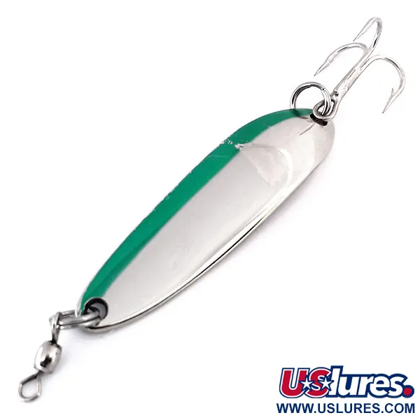 Vihreä maali peittää tasan puolet tämän solakan lusikan pituudesta, luoden jyrkän kontrastin toisen puolen kiillotetulle nikkelipinnalle. Tämä tuotekoodilla 10297 tunnistettava Luhr Jensen Krocodile Die #3 on edelleen suosikki kalastajille, joiden on päästävä syvälle heitettäessä tai vedettäessä lohta. Kääntöpuolella on selkeä, klassinen Krocodile-logon stanssaus sekä tieto sen alkuperästä Hood Riveristä, Oregonista. Pituudeltaan 5,5 cm (2 1/4") ja painoltaan 10 g (1/3 oz) oleva paksumetallinen rakenne antaa sen upota ja säilyttää uintisyvyytensä tehokkaammin kuin ohuemmat vakiolusikat. Yksilö on 5/5 kunnossa, ja siinä on loistava peilimäinen heijastus nikkelissä sekä eloisa, ehjä värikerros. Se on varustettu vahvalla kolmihaarakoukulla ja tehtaalla asennetulla tynnyrileikarilla, joka estää siiman kiertymisen.