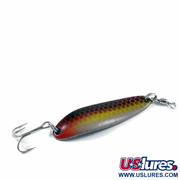 Erottuva kennotettu suomukuvio määrittää tämän 5,5 cm (2 1/4") lusikkauistimen etupuolta, jossa on tummasta yläreunasta lämpimän ruskean ja kullankeltaisen kautta hopeiseen pohjaan vaihtuva liukuväri. Painoltaan 10 g (1/3 oz) painava Luhr Jensen Krocodile Die #3 on rakenteeltaan paksu ja kapea, mikä on optimoitu Great Lakes -järvillä tai rannikon aallonmurtajilla usein tarvittaviin pitkiin heittoihin. Kääntöpuolelle metalliin on selkeästi meistetty Luhr Jensen -tuotemerkki ja sen valmistusmaa USA. Tämä tuotekoodilla 2717 tunnistettu yksilö on poikkeuksellisessa kunnossa (luokitus 5/5). Varustukseen kuuluu terävä kolmihaarakoukku ja päähän asennettu levari siimankierron estämiseksi. Paksun rungon ansiosta viehe saavuttaa syvyyden nopeasti virrassa säilyttäen silti sille ominaisen vaappuvan uinnin kelauksen aikana.
