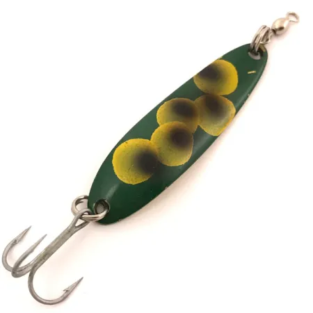 Tämä 1/3 oz (10 g) lusikkauistin on viimeistelty erottuvalla Frog-kuviolla, jossa on kirkkaankeltaisia pilkkuja tummilla keskustoilla syvän metsänvihreällä taustalla. Kooltaan 2 1/4" (5,5 cm) pitkä uistin edustaa klassista Luhr-Jensen-profiilia; se on suunniteltu tavallisia lusikoita kapeammaksi ja paksummaksi pidempien heittojen saavuttamiseksi. Messinginsävyisen metallin kääntöpuolelle on selkeästi meistetty "KROCODILE", "DIE #3" ja "HOOD RIVER, ORE", mikä kertoo sen amerikkalaisesta alkuperästä. Tässä tuotekoodilla 3866 kulkevassa yksilössä on metallipuolella kevyitä, rehellisiä käytön jälkiä, kun taas maalattu etupuoli on säilynyt erittäin puhtaana ja kirkkaana, saaden kuntoluokitukseksi 4/5. Varustukseen kuuluu vankka kolmihaarakoukku, joka on kiinnitetty lukkorenkaalla, sekä yläpään leikari, joka estää siiman kiertymistä. Krocodile on suunniteltu lajeille lohesta järvitaimeneen, ja se on tunnettu vakaasta huojuvasta liikkeestään, joka jäljittelee tehokkaasti saaliskalaa tasaisella kelauksella.
