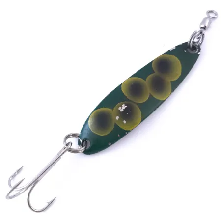 Tämä paksusta metallista valmistettu 5,5 cm (2 1/4") pituinen lusikkauistin on varustettu klassisella "Frog"-kuviolla, jossa on chartreuse-värisiä ympyröitä syvän metsänvihreällä pohjalla. Kiillotetun nikkelinvärisen kääntöpuolen selkeät leimat "KROCODILE DIE #3" ja valmistuspaikka "Hood River, Ore." todistavat tästä 10 g (1/3 oz) vieheen kestävyydestä, josta Luhr Jensen tunnetaan. Tuotekoodilla 4048 tunnistettu yksilö sisältää alkuperäiset varusteet: leikarilla varustetun uistinrenkaan päässä ja kolmihaarakoukun perässä. Tässä Die #3 -mallissa on puhdas nikkelipinta koveralla puolella ja tarkka maalausjälki kuperalla puolella, vastaten kuntoarviota 4/5. Sen kapea mutta painava profiili on suunniteltu erityisesti pitkiin heittoihin ja syvän veden uisteluun, missä uintisyvyyden säilyttäminen on kriittistä. Chartreuse-täplien päällä oleva valkoinen pistekuviointi antaa hienovaraisen yksityiskohdan, joka on tyypillistä Oregonin tehtaan vintage-maalauksille.