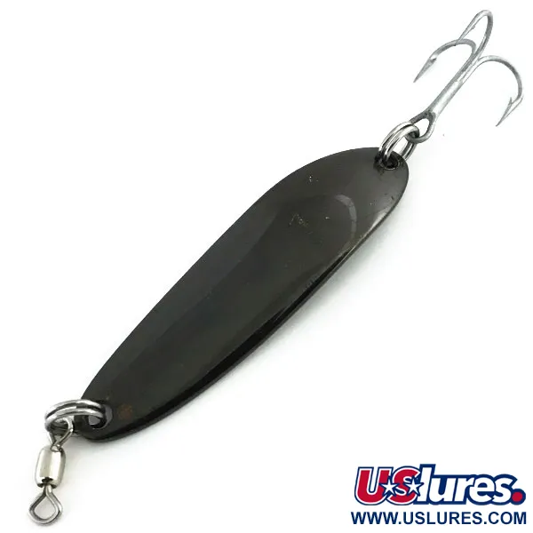 Sisäpuolen kuperalla puolella oleva leimaus osoittaa tämän aidoksi Luhr Jensen -tuotteeksi Hood Riverin tehtaalta Oregonista. Pituudeltaan 5,5 cm (2 1/4") oleva uistin on varustettu 'Die #3' -leimalla ja se painaa 10 g (1/3 oz), soveltuen erinomaisesti heittokalastukseen ja uisteluun. Tasainen musta viimeistely tarjoaa selkeän hahmon, mikä on taktinen valinta hämärissä olosuhteissa tai sameassa vedessä kalastaville. Tämä vintage-löytö, tuotekoodi 8775, on käyttämätön ja kunnoltaan 5/5. Tehtaan asentamiin varusteisiin kuuluvat hopeanvärinen kolmihaarakoukku uistinrenkaalla sekä leikari siimalenkissä estämässä siiman kiertymistä kelattaessa. Painava ja kapea metallirunko on suunniteltu antamaan lisäpituutta heittoihin säilyttäen samalla vakaan uintiliikkeen.