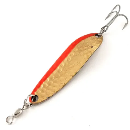 Vasaroitu messinki peittää suurimman osan tämän 5,5 cm (2 1/4") lusikkauistimen pinnasta, tarjoten tekstuurin, joka heijastaa valoa useista eri kulmista. Toista reunaa pitkin kulkee selkeä punainen raita, joka paljastaa todellisen luonteensa syvissä vesissä tai hämärässä erittäin näkyvänä UV-reaktiivisena elementtinä. Painoltaan 10 g (1/3 oz) oleva Luhr Jensen Krocodile Die #3 (Tuotekoodi: 12325) on valmistettu kokoonsa nähden paksusta materiaalista, mikä tekee siitä luotettavan valinnan pitkiin heittoihin. Koukutus on erinomaisessa kunnossa, ja siinä on tukeva tynnyrileikari kärjessä sekä terävä kolmihaarainen koukku, joka on kiinnitetty kestävällä uistinrenkaalla. Tämä yksilö on 5/5-kunnossa, ollen puhdas ja hyvin säilynyt. Usein lohen ja taimenen kalastuksessa suosittu Krocodilen kapea ja paksu muotoilu on perusvaruste kalastajille, joiden on päästävä nopeasti syvyyteen. Se on suunniteltu tasaiseen uintiliikkeeseen heitossa, uistelussa tai jopa pystyjigauksessa, edustaen Luhr Jensenin USA:ssa valmistettua laatua.