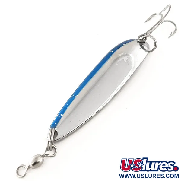 Alapuolelle on selvästi leimattu ”KROCODILE DIE #4” sekä valmistuspaikka Hood River, Oregon, mikä on Luhr Jensenin historiallisen tuotannon tunnusmerkki. Tässä nimenomaisessa yksilössä on klassinen Nickel / Blue -väritys, jossa kirkkaan sininen raita kulkee kiillotetun nikkelirungon ulkoreunaa pitkin; maalatussa pinnassa on havaittavissa hieman aitoa kulumaa. Painoltaan 1/2 oz (14 g) ja pituudeltaan 2 1/2" (6,5 cm) oleva lusikkauistin on valmistettu paksusta materiaalista, mikä auttaa saavuttamaan huomattavia heittopituuksia. Varusteet ovat kestäviä: vankka uistinrengas, terävä kolmihaarakoukku ja laadukas leikari pään päässä vähentämässä siiman kiertymistä. Kuntoluokituksella 5/5 nikkelipinta säilyttää kirkkaan, heijastavan laadun, mikä tekee siitä perusvieheen lohen tai taimenen kalastukseen. Krocodilen muoto mahdollistaa tasaisen huojuvan uinnin eri nopeuksilla, ja sitä käytetään usein heittokalastukseen, uisteluun tai jopa pystyjigaukseen. Tämän vieheen kaikki tiedot on luetteloitu tuotekoodilla 11868.