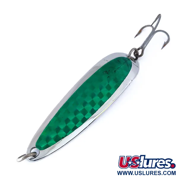 Tämä 21 gramman (3/4 oz) painoinen lusikkauistin on varustettu eloisalla vihreällä prismateipillä, jossa on ruutukuvio etupuolella. Tämä Luhr Jensen Krocodile Die #5 (tuotekoodi 10472) on pituudeltaan 8,5 cm (3 1/4") ja se edustaa tuotemerkin klassista kapeavyötäröistä muotoilua Hood Riverin, Oregonin valmistusajalta. Uistimen taustapuoli on kiillotettua nikkeliä, ja siinä on syvä ja selkeä leima tuotemerkin ja Oregonin alkuperän tiedoilla. Varustukseen kuuluu vankka kolmihaarakoukku, joka on kiinnitetty uistinrenkaalla perään, sekä vastaava uistinrengas kärjessä siiman kiinnittämistä varten. 5/5-kunnossa nikkelipinnat kiiltävät kirkkaasti ja puhtaasti, ja prismateippi on tukevasti paikallaan ilman reunojen irvistämistä. Tätä painoa ja profiilia suosivat kalastajat, jotka haluavat tavoittaa syvempiä vesikerroksia tai saada lisää heittopituutta vastatuuleen. Die #5 -koko on erinomainen valinta suurille taimenille, lohille tai erilaisille merikaloille.