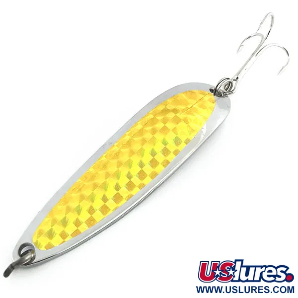 Painoltaan 1 unssin (28 g) painava klassinen heitto- ja uistelulusikka on perusviehe niille, jotka tavoittelevat syvän veden lajeja, joissa heittopituus on avainasemassa. 3 1/4 tuuman (8,5 cm) runko on viimeistelty kirkkaalla Nikkeli / Kultahologrammilla, joka hyödyntää geometrista prismakuviota valon vangitsemiseen ja heijastamiseen. Koveralle puolelle on selkeästi leimattu Luhr Jensen Hood River, Oregon -brändäys. Tämä nimenomainen yksilö, tuotekoodi 8766, edustaa merkin tunnettua vahvaa metallirakennetta. Kalastajat luottavat usein tähän muotoiluun sen kyvyssä halkoa tuulta rannalta tehdyissä pitkän matkan heitoissa. Varustukseen kuuluu kestävä uistinrengas kärjessä ja luja kolmihaarakoukku perässä. Viehe on 5/5-kunnossa, ja heijastavat pinnat sekä kultainen suomuteippi ovat säilyneet terävinä ja hyväkuntoisina.
