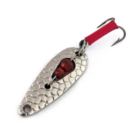 Hopeanväriseen metalliin selkeästi stanssattu ”J. WALKER U.S.A.” -merkintä vahvistaa tämän vintage-vieheen amerikkalaisen alkuperän. Tämä pituudeltaan 3,4 cm (1 1/4”) kompakti viehe on viimeistelty erottuvalla vasaroidulla nikkelipinnalla, joka on suunniteltu jäljittelemään luonnollisia kalansuomuja. Rungon keskellä olevaan aukkoon on sijoitettu kaksi läpikuultavaa punaista helmeä, jotka luovat voimakkaan visuaalisen kontrastin heijastavaa runkoa vasten. KSM J-Walker painaa 4,4 g (1/8 oz) ja on varustettu kolmihaarakoukulla, jonka varren kirkkaanpunainen muoviletku toimii petokalojen iskupisteenä. Tämä 19800-mallin yksilö on erinomaisessa 5/5-kunnossa, ja kaikki metallipinnat sekä osat ovat säilyttäneet alkuperäisen kiiltonsa. Muotoilu edustaa klassisen amerikkalaisen viehevalmistuksen käytännönläheistä mutta tehokasta tyyliä.