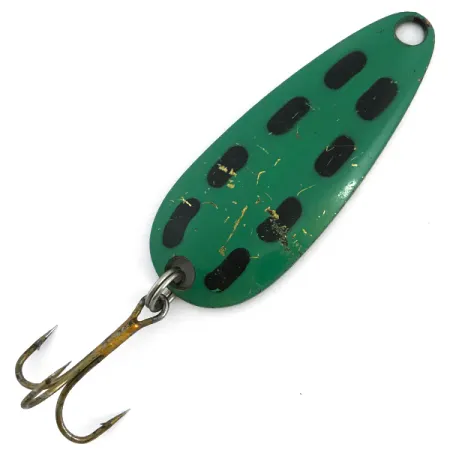 Messinginväriseen taustapuoleen selvästi leimattu "LEN THOMPSON NO. 0" -merkintä tunnistaa tämän Kanadassa valmistetun aarteen. Pituudeltaan 6,5 cm (2 1/2") lusikkauistimessa on klassinen vihreä etupuoli, jota korostavat näkyvät mustat pilkut ja kultaiset hileet, jotka jäljittelevät luonnollista saalista. Painoltaan 17 g (3/5 oz) uistin on suunniteltu hitaaseen, vaappuvaan liikkeeseen, mikä on tehnyt siitä vuosikymmenien ajan kestosuosikin hauen ja harmaanieriän pyynnissä. Tämä kyseinen yksilö, tuotekoodiltaan 6765, on 4/5-kunnossa; sen kuperalla puolella on hyvin säilynyt maalipinta ja koveralla sisäpuolella puhdas kultaviimeistely. Varustukseen kuuluu tukeva uistinrengas ja vintage-kolmihaarakoukku, joka on rakenteellisesti hyvässä kunnossa. Vuodesta 1929 lähtien Len Thompson on panostanut tämän lusikan tasapainoon, tehden siitä luotettavan valinnan heitto- tai vetouisteluun erilaisissa makean veden olosuhteissa.