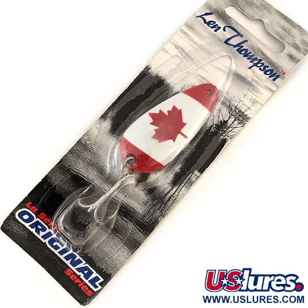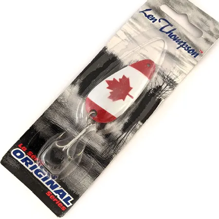 Tässä lusikkauistimessa on näyttävä punavalkoinen Kanadan lipun kuvio ja keskellä vaahteranlehti, mikä heijastaa sen valmistusperinteitä Lacombessa, Albertassa. Kooltaan 1/2 oz (14 g) ja pituudeltaan 2" (5 cm) oleva #00-koko on monipuolinen työkalu heittokalastukseen tai vetouisteluun. Tämä tuotekoodilla 11192 seurattu yksilö on käyttämätön ja alkuperäisessä pakkauksessaan. Thompson-Pallister Bait Co. Ltd. on valmistanut näitä vieheitä vuodesta 1929 lähtien painottaen tasapainoista muotoilua, joka mahdollistaa tasaisen hitaan vaappuvan uinnin. Perään on asennettu hopeanvärinen kolmihaarakoukku, joka noudattaa Original Series -sarjan laatustandardeja. Pakkauksen kääntöpuolella on lyhyt historiikki yrityksen alkuvaiheista Saskatchewanin Abernethyssä ja lähes vuosisadan mittaisesta tuotannosta Länsi-Kanadassa.