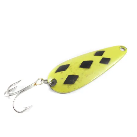Viisi mustaa timanttia klassisessa kuviossa kirkkaankeltaisella pohjalla määrittävät tämän kanadalaisen lusikkauistimen ulkonäön. Painoltaan 3/4 oz (21 g) ja pituudeltaan 2 3/4" (7 cm), tämä koon #1 malli tarjoaa näyttävän profiilin hauen tai harmaanieriän kalastukseen. Messinkipintaisessa taustassa on valmistajan Len Thompsonin nimi, jonka tuotantohistoria alueella ulottuu vuoteen 1929. Tässä yksilössä, tuotekoodiltaan 1748, on vähäisiä käytön jälkiä maalissa ja metallissa, mutta se on kunnoltaan 4/5. Hopeanvärinen kolmihaarakoukku on kiinnitetty perään vahvalla uistinrenkaalla, tehden siitä valmiin heitto- tai vetouisteluun. Metallin erityinen muotoilu on suunniteltu luomaan hidas, vaappuva liike kelattaessa. Messinkinen pohja on näkyvissä kääntöpuolella, tarjoten hienovaraista välkettä kontrastina huomiokeltaiselle etupuolelle.
