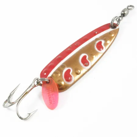 Kuparointi ja taustapuolen meistetyt kuopat korostavat kanadalaista perinteistä uistimenvalmistustaitoa. Tämä 25 gramman (1 unssin) painoinen ja 7 cm (2 3/4") pituinen Len Thompson #13 on varustettu selkeällä puna-valkoisella pisarakuvioinnilla kiillotetun kuparirungon päällä. Tämä nimenomainen tuote, tuotekoodiltaan 3287, on 5/5-kunnossa, ja siinä on kirkas pinta sekä hyvin säilynyt maalipinta. Varustukseen kuuluu vankka kolmihaarakoukku, läpikuultava vaaleanpunainen houkutinlevy sekä kestävä leikari etummaisessa uistinrenkaassa. Koveralla sisäpuolella valmistajan leima on lyöty selkeästi metalliin teksturoidun pinnan keskelle. Monikäyttöisyyteen suunniteltu lusikka on suosittu heittokalastuksessa ja uistelussa hauelle, lohelle ja harmaanieriälle.