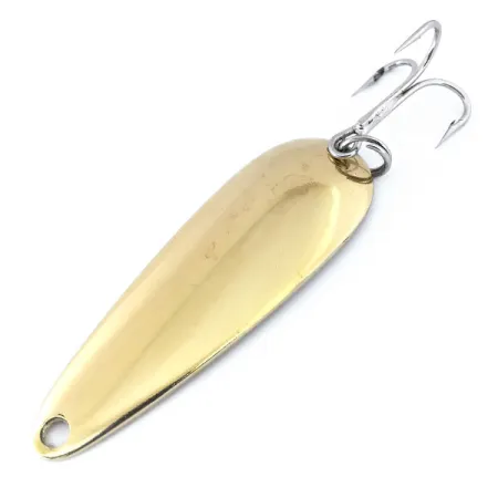 Tämä 3 1/4" (8 cm) pituinen massiivinen metallinen lusikkauistin on viimeistelty kirkkaalla kullalla, joka antaa voimakkaan metallisen välkkeen. Tämä tuotekoodilla 10732 löytyvä Len Thompson #2 on painava 1 oz (28 g) uistin, joka sopii erinomaisesti syvempien rakenteiden tavoittamiseen heitossa tai uistelussa hauelle ja harmaanieriälle. Uistimen koveralla puolella on klassinen "LEN THOMPSON NO. 2" -leima, joka on merkki brändin kanadalaisesta valmistushistoriasta vuodesta 1929 alkaen. Painotus tuottaa hitaasti vaappuvan liikkeen, joka jäljittelee suurempaa täkykalaa. Varustukseen kuuluu terävä, hopeanvärinen kolmihaarakoukku ja kestävä uistinrengas, jotka molemmat ovat erinomaisessa kunnossa. Tämä yksilö on 5/5-kunnossa, ja siinä on puhdas, erittäin heijastava pinta molemmin puolin. Kultainen väri on kirkas ja tarjoaa hyvän näkyvyyden petokaloille eri vesiolosuhteissa.