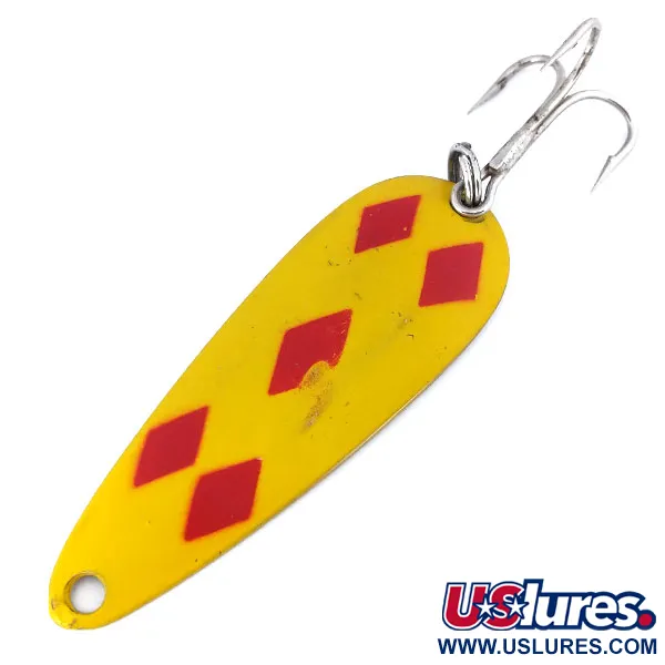 Tämä 28 g (1 oz) painoinen lusikkauistin on varustettu koetellulla Five of Diamonds -värityksellä. Keltainen emalipinta on koristeltu viidellä punaisella timantilla, mikä on ollut merkin tunnusmerkki vuodesta 1929 lähtien. Messinkisessä kääntöpuolessa on stanssaus ”LEN THOMPSON NO. 2” ja valmistusmaa Kanada. Tuotteessa (koodi 10774) on luotettava hopeanvärinen kolmihaarakoukku ja vahva uistinrengas. Kunto on 4/5, ja siinä on vain vähäisiä jälkiä pakissa säilytyksestä. Paksu metallirunko on suunniteltu tukemaan vieheen tyypillistä hidasta ja vaappuvaa uintia syvän veden petokaloja tavoiteltaessa.