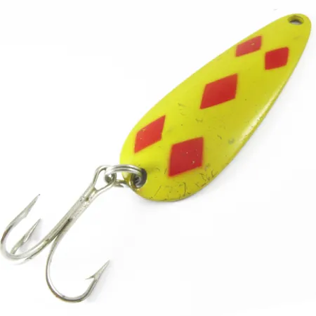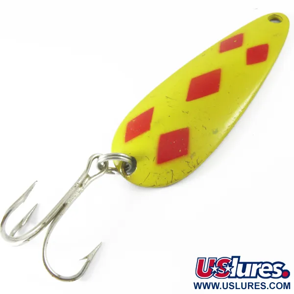 Viisi punaista timanttia on maalattu tarkasti kirkkaankeltaiselle pohjalle tässä kanadalaisessa klassikossa. Painoltaan 28 g (1 oz), tässä nimenomaisessa lusikkauistimessa (tuotekoodi 3681) on perinteinen messinkisävyinen tausta, jota keräilijät etsivät varhaisista Len Thompson #2 -malleista. Merkin perustamisesta vuodesta 1929 lähtien nämä vieheet on rakennettu matkimaan pienen salakan profiilia, ja tässä 8 cm (3 1/4") yksilössä on erottuva stanssattu teksti kääntöpuolella. Hopeisella kolmihaarakoukulla varustettu viehe on perusvaruste hauen ja harmaanieriän heitto- ja uistelukalastukseen. Five of Diamonds -värikuvio on kiistatta luettelon tunnetuin, ja se on tarkoitettu tarjoamaan hyvä näkyvyys erilaisissa vesiolosuhteissa. Kuntoluokitukseltaan 4/5 oleva keltainen maali osoittaa joitakin hajanaisia naarmuja ja kevyttä käytön jälkeä, vaikka metallin ja osien rakenteellinen eheys on edelleen erinomainen. Lusikka on suunniteltu hitaaseen, vaappuvaan uintiin, mikä on tekninen piirre, joka on pysynyt valmistajalle vakiona lähes vuosisadan ajan.