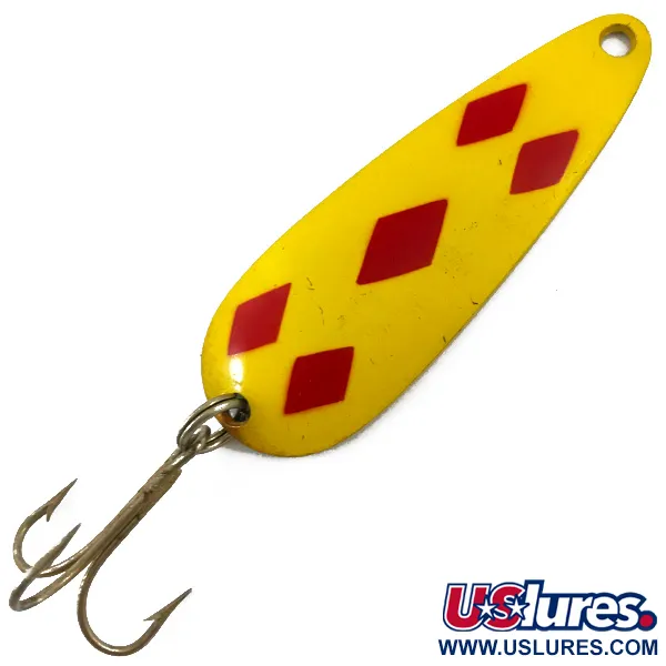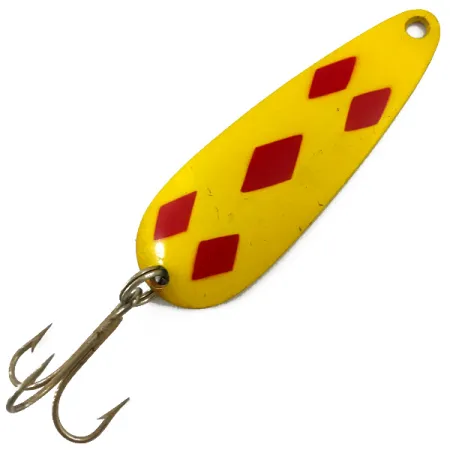 Viisi rohkeaa punaista vinoneliötä kirkkaankeltaisella pohjalla merkkaavat muotoilua, joka on ollut kalastusreppujen perusvaruste siitä lähtien, kun yritys aloitti tuotantonsa vuonna 1929. Tämä 28 gramman (1 oz) painoinen Len Thompson #2 (tuotekoodi 4653) on valmistettu paksuudella, joka tukee sen tunnusomaista hidasta huojuvaa uintia kelattaessa. Uistimen kääntöpuolella on selkeä leimaus "LEN THOMPSON NO. 2", josta näkyy alla oleva messinkinen perusmetalli. Kuntoluokituksella 5/5 maali on säilynyt kirkkaana ja varusteet, mukaan lukien alkuperäinen kolmihaarakoukku, ovat hyvässä kunnossa. Tämä 8 cm pituinen yksilö on osoitus merkin maineesta tasapainoisena uistimena, mikä tekee siitä luotettavan valinnan heitto- tai uistinkalastukseen syvemmillä vesillä, joilla lohet ja sateenkaariraudut usein liikkuvat.