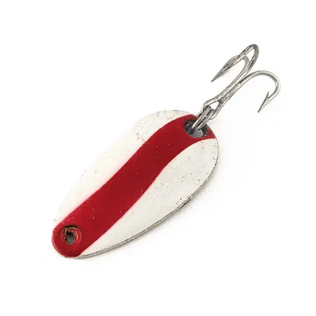 Vinossa kulkeva punainen raita luo jyrkän kontrastin tämän kanadalaisen klassikon valkoiseksi emaloitua pintaa vasten. Tämä Len Thompson #6 lusikkauistin, tuotekoodilla 11190, heijastaa muotoilufilosofiaa, joka on pysynyt lähes muuttumattomana merkin perustamisesta eli vuodesta 1929 lähtien. 1 tuuman (2,5 cm) messinkirunko on leimattu selvästi kääntöpuolelle valmistajan nimellä ja mallikoolla, korostaen kiillotettua metallipintaa. Painoltaan 1/8 unssia (3,5 g) oleva viehe on suunniteltu heittokalastukseen tai uisteluun, ja se jäljittelee pienen syöttikalan profiilia. Koukutus on erinomaisessa kunnossa, sisältäen tukevan kolmihaarakoukun ja uistinrenkaan. Kuntoluokituksella 5/5 emali on hyvin säilynyt ja messinki pitää alkuperäisen kiiltonsa. Sen uinti perustuu hitaaseen vaappuvaan liikkeeseen, joka on tunnettu ominaisuus harmaanieriän ja hauen iskurefleksin herättämisessä.
