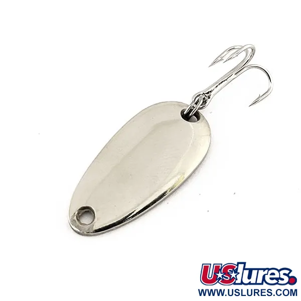 Tämän nikkelöidyn lusikkauistimen koveraan alapuolelle on selkeästi leimattu sanat "LEN THOMPSON NO. 6", mikä tunnistaa mallin, joka on kuulunut kalastajien vakiovarusteisiin jo vuosikymmeniä. Tarkalleen 2,5 cm (1") pitkä ja kevyet 3,5 g (1/8 oz) painava uistin on mitoitettu petokalojen hienovaraiseen kalastukseen erilaisissa olosuhteissa. Kirkas nikkeliviimeistely tarjoaa puhtaan, heijastavan pinnan, joka jäljittelee pienen saaliskalan suomuja. Sen pisaramainen muoto on tasapainotettu tuottamaan hitaasti vaappuva uinti, mikä on tekninen ominaisuus, joka on tehnyt merkistä suositun hauen, lohen ja harmaanieriän kalastuksessa. Tämä kyseinen kappale, tuotekoodi 11270, on 5/5-kunnossa, ja siinä on erittäin hyvin säilynyt runko sekä terävä, hopeanvärinen kolmihaarakoukku. Koukku on kiinnitetty tukevasti peräpään tarkkuusporattuun reikään, joten se on valmis heittokalastukseen, uisteluun tai jiggaukseen.