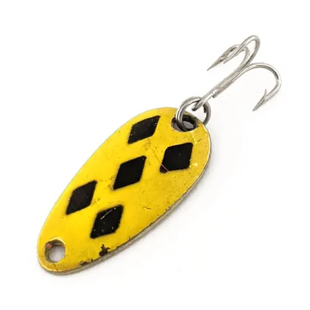Tässä Kanadassa valmistetussa klassikossa on messinkiviimeistely kääntöpuolella ja syvä "LEN THOMPSON NO. 6" -leima, joka kertoo sen pitkästä historiasta. Tuotekoodilla 11313 luetteloitu lusikkauistin on varustettu kirkkaankeltaisella emalipinnalla, jota koristaa viisi näyttävää mustaa timanttikuviota. Se painaa 3,5 g (1/8 oz) ja on pituudeltaan kompakti 2,5 cm (1"), mikä tekee siitä erinomaisen valinnan kevyeen heittokalastukseen tai uisteluun taimenelle ja ahvenelle. Yksilö on 5/5-kunnossa, maali on säilynyt erinomaisesti ja metallipinta on puhdas. Len Thompson on käyttänyt tätä nimenomaista pisaramuotoa pienten syöttikalojen jäljittelemiseen vuodesta 1929 lähtien, ja muotoilu on pysynyt lähes muuttumattomana vuosikymmenien ajan. Viehe on varustettu terävällä, hopeoidulla kolmihaaralla, joka on kiinnitetty tavallisella uistinrenkaalla rungon yläosaan.