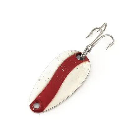 Silmiinpistävä diagonaalinen punainen raita kulkee tämän pienen 2,5 cm (1 tuuma) lusikkauistimen kermanvalkoisen etupuolen poikki. Painoltaan 3,5 g (1/8 oz) oleva vintage-löytö kantaa tuotekoodia 11497 ja on Len Thompson -malliston perustuote. Kääntöpuolella on messinkiviimeistely ja selkeä leima "NO. 0", huolimatta sen luettelomerkinnästä #6. Kalastajat luottavat näihin lusikoihin niiden tyypillisen hitaan vaappuvan liikkeen vuoksi heittokalastuksessa tai uistelussa tavoiteltaessa lajeja kuten taimenta ja ahventa. Tämä yksilö on 5/5-kunnossa, ja siinä on kevyttä pintakulumaa ja hienoa halkeilua maalipinnassa sekä tummumista ja hapettumista messingissä ja alkuperäisessä kolmihaarakoukussa. Pisaramainen profiili on klassista Len Thompsonia, malli jota on valmistettu vuodesta 1929 lähtien jäljittelemään pientä täkykalaa.