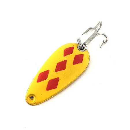 Viisi punaista timanttia on tarkasti sabluunalla kuvioitu kirkkaankeltaiseen emaliin, muodostaen ikonisen "Five of Diamonds" -kuvion, joka on tehnyt näistä kanadalaisista lusikkauistimista kuuluisia vuodesta 1929 lähtien. Tämä yksilö on Len Thompson #7, pituudeltaan 3,4 cm (1 1/4") ja painoltaan 5 g (3/16 oz). Kääntöpuolella on kirkas messinkipinta, johon on syvään stanssattu valmistajan merkintä "LEN THOMPSON No.7" aitouden merkiksi. Suunniteltu erilaisiin tekniikoihin, kuten heitto- ja uistelukalastukseen, viehe on varustettu hopeanvärisellä kolmihaarakoukulla, joka on kiinnitetty tukevalla uistinrenkaalla. Tuotekoodilla 11533 rekisteröity uistin on 5/5-kunnossa, ja siinä on sileä pinta sekä korkeakontrastinen maalaus. Kompakti profiili on painotettu erityisesti jäljittelemään pikkukalan liikkeitä vesipatsaassa.