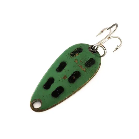 Tässä 3,5 cm (1 1/2") kokoisessa kanadalaisessa lusikkauistimessa on eloisa sammakkokuviointi, ruohonvihreä yläpuoli ja erottuvat mustat soikeat täplät. Messinginväriseen alapuoleen on selkeästi meistetty "LEN THOMPSON NO 7" -merkintä, mikä kertoo valmistajan perinteistä jo vuodesta 1929. Painoltaan 5 g (3/16 oz) uistin on suunniteltu hitaaseen huojuvaan uintiliikkeeseen, joka jäljittelee pientä syöttikalaa. Hopeanvärinen kolmihaarakoukku on kiinnitetty luotettavalla uistinrenkaalla, ja yleiskunto on kunnioitettava 4/5, osoittaen lieviä käytön jälkiä. Tuotekoodilla 11545 listattu uistimen kyynelmuoto ja messinkirunko ovat Len Thompson -malliston klassisia piirteitä.