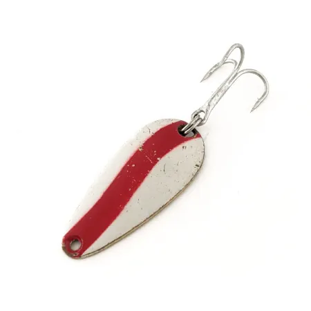Messinkisen taustapuolen 'LEN THOMPSON No. 7' -stanssaus paljastaa tämän lusikan olevan kanadalainen klassikko valmistajalta, joka on toiminut jo vuodesta 1929. Rohkea punainen aaltokuvio valkoiseksi maalatulla pinnalla luo voimakkaan kontrastin, joka on suunniteltu herättämään petokalojen, kuten hauen tai harmaanieriän, huomio. Tarkalleen 3,5 cm (1 1/2 tuumaa) pitkä pisaramainen profiili on tuttu näky monen kokeneen kalastajan vieherasioissa. 5 g (3/16 oz) painoisena se tuntuu vankalta heittokalastuksessa tai kevyessä uistelussa eri olosuhteissa. Valkoisessa maalipinnassa on muutamia ikääntymisestä johtuvia pieniä jälkiä, mutta sen kuntoarvio on vahva 5/5. Tunnusomaisesta hitaasta vaappuvasta uinnistaan tunnettu No. 7 -malli on luotettava valinta nirsommallekin kalalle. Viehe on varustettu kestävällä hopeisella kolmihaarakoukulla ja sen tuotekoodi on 11642.