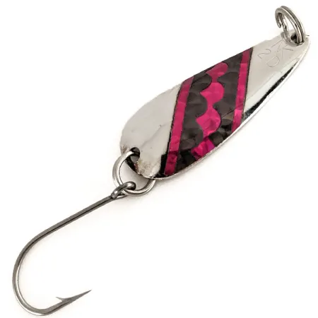 Tämä 11 gramman (2/5 oz) painoinen messinkilusikka on varustettu klassisella Northern King -profiililla, joka tuli markkinoille vuonna 1984. Nikkeli / Punainen -väritys on tehty korkealaatuiseen messinkirunkoon, ja hopeinen viimeistely takaa näkyvyyden syvissä vesissä. Lusikan pituus on 5,5 cm (2 1/4"), ja sen tuotekoodi on 12484, mikä edustaa Len Thompsonin kanadalaista valmistusperintöä. Tämä uistin on 5/5-kunnossa, eikä sen kiiltävissä pinnoissa tai yksittäiskoukussa ole kulumisen merkkejä. Kalastajat käyttävät näitä usein lohen, kirjolohen tai harmaanieriän vetouistelussa luottaen painavaan messinkiin halutun syvyyden saavuttamiseksi. Lusikan etupuolelle on lyöty merkintä NK 2 D, ja takapuoli on viimeistelty puhtaalla, heijastavalla hopeoinnilla.