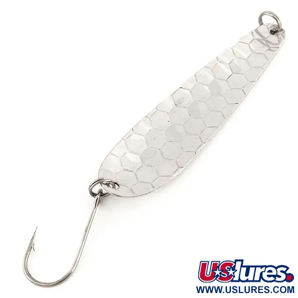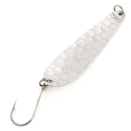 Klassinen vasaroitu kuviopinta peittää tämän hopeoidun messinkilusikan pinnan. Muotoilu on suunniteltu maksimoimaan valon heijastus syvän veden uistelussa. Tämä 14 g (1/2 oz) painava ja 9,5 cm (3 3/4") pitkä Len Thompson Northern King NK28 on hyvin säilynyt yksilö, jonka tunnistaa tuotekoodista 12691. Viehe on 5/5-kunnossa, ja siinä on kirkas ja puhdas viimeistely, joka on tyypillistä tämän kanadalaisen valmistajan käyttämälle aidolle hopeoinnille sarjan julkaisusta (1984) lähtien. Tämä nimenomainen malli tunnetaan kalastajien keskuudessa hitaasta huojuvasta uinnistaan, joka on erityisen tehokas harmaanieriän, lohen ja steelheadin kalastuksessa. Lusikan koveralla sisäpuolella pyrstön lähellä oleva "NK 28" -leima on edelleen terävä ja selvästi luettavissa. Koukutuksena on yksi suuri koukku, joka on kiinnitetty kestävällä uistinrenkaalla, ja päädyssä on vastaava kiinnityspiste siimalle tai leikarille.