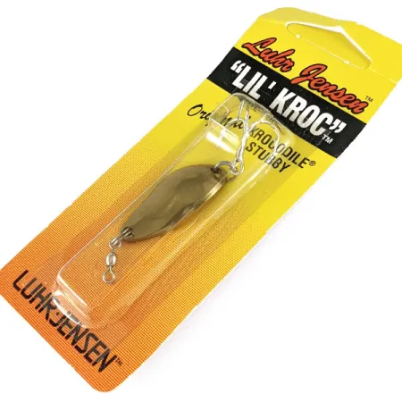 Kirkkaaksi kullattu kompakti lusikkauistin painaa 4,5 g ja on pituudeltaan 3,2 cm. Luhr Jensenin valmistama Lil' Kroc (Krocodile Stubby) tarjoaa tavallista Krocodile-uistinta lyhyemmän ja tiiviimmän profiilin erityisiin heittotarpeisiin. Tämän yksilön tuotekoodi on 1123-018-0002 (sisäinen viite 17153), ja se toimitetaan alkuperäisessä vintage-pakkauksessaan yrityksen Hood Riverin, Oregonin toiminnan ajalta. Täysmessinkisessä rungossa on etuosaan kiinnitetty tynnyrileikari siiman kiertymisen estämiseksi sekä terävä uistinrenkaalla varmistettu kolmihaarakoukku perässä. Uistin on käyttämätön ja on edelleen alkuperäisessä myyntipakkauksessaan. Pakkauksen taustapuolella on monikielinen kuvastotarjous sekä valmistuspäivämäärä 21. lokakuuta 1997.