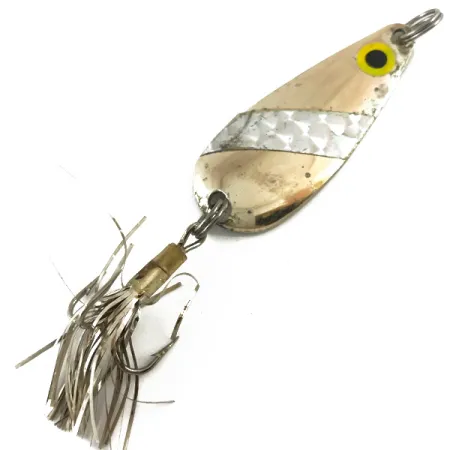 Hopeointi 5,5 cm (2 1/4") rungossa antaa perusvälkkeen tälle Joe's Fliesin valmistamalle Lindy Finsel -lusikkauistimelle. Mallin nimi on leimattu selvästi lusikan taustapuolelle, mikä vahvistaa sen alkuperän amerikkalaisena kalastushistoriana. Timanttikuvioinen heijastinteippi halkaisee hopeoidun pinnan, ja yläosan uistinrenkaan lähellä on maalattu keltainen silmä mustalla pupillilla. 10 g (1/3 oz) painava uistin on varustettu koukulla, jossa on kimalteleva hopeinen tinselipyrstö. Tuotekoodilla 4497 varustettu yksilö on 4/5-kunnossa, ja sen metallipinta on puhdas ja hyvin säilynyt. Pienet pintajäljet hopeoinnissa kertovat sen vintage-historiasta vaikuttamatta rakenteelliseen kestävyyteen.
